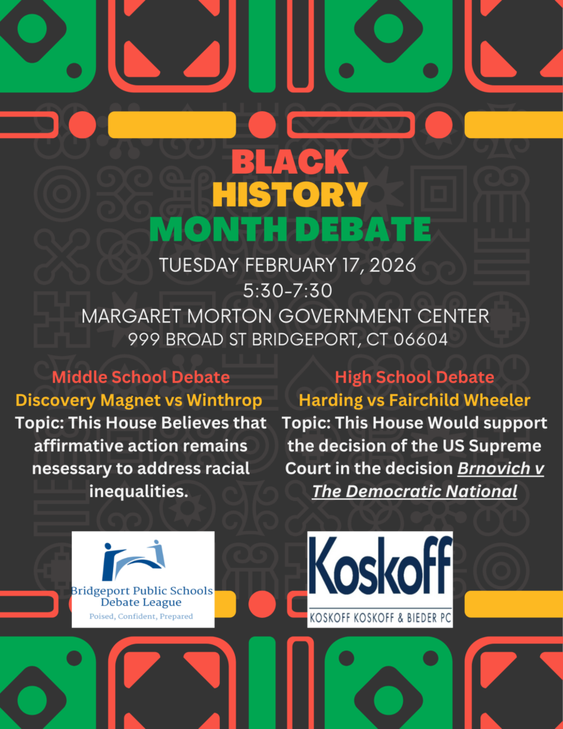 On Saturday March 29th the Bridgeport Public Schools Debate League will hold it’s first all-female tournament. The event will showcase the incredible talent of teams from Cesar Batalla, Discovery Magnet, High Horizons, Marin, Park City Prep, Tisdale School, and John Winthrop. The tournament will take place at Discovery Magnet.